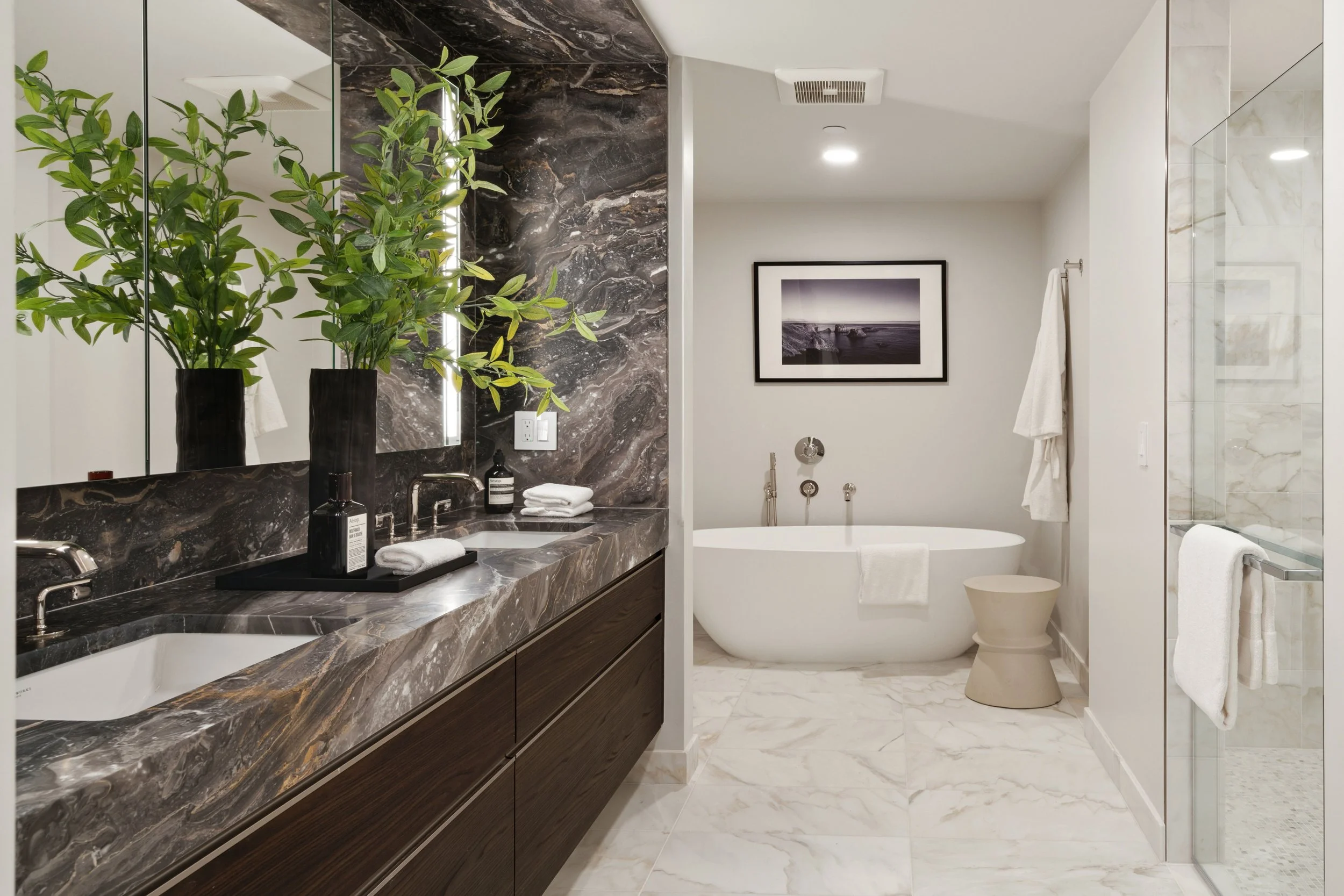 Spacious spa-like bathrooms are dressed in imported Italian stone and adorned with Waterworks fixtures.